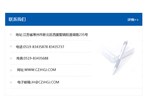 地址:常州市新北區友邦商務大廈1幢16、17層  電話:0519-85101652  傳真:0519-85112595  郵編:213022  網址:www.cz-jiayue_cn.beabl.com  郵箱:xiajifengaa@163.com